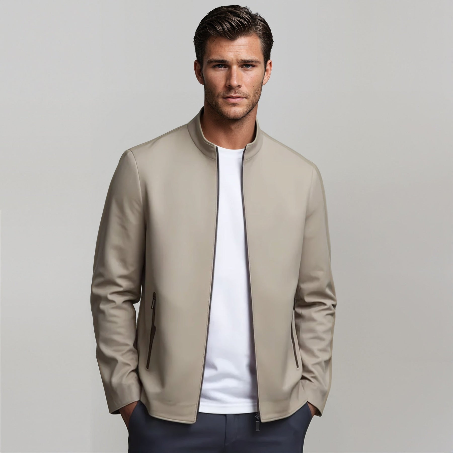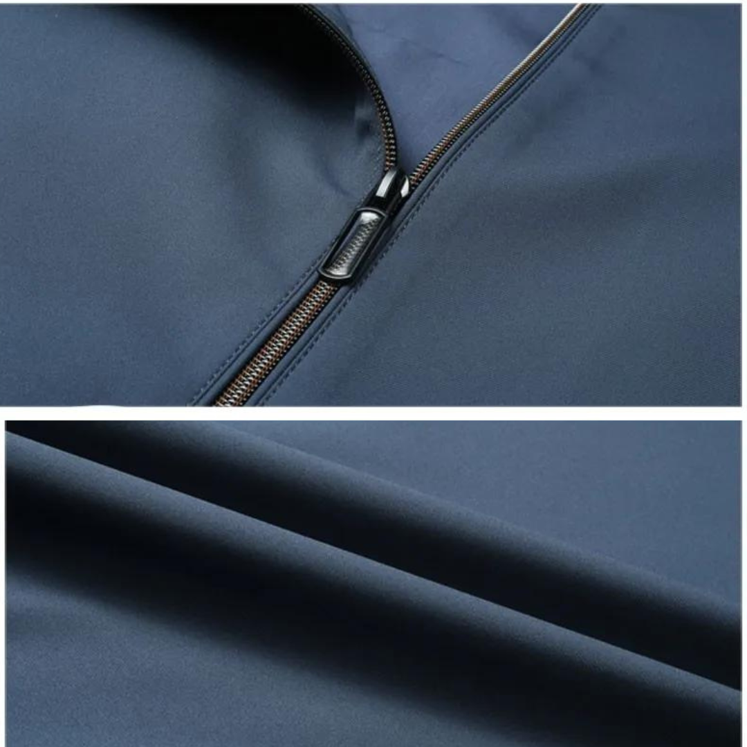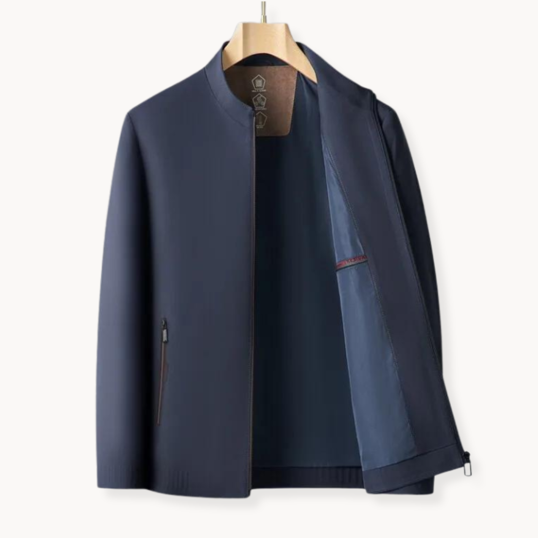 This sleek navy blue bomber jacket combines modern minimalism with versatile functionality, making it a perfect outerwear choice for any season.
