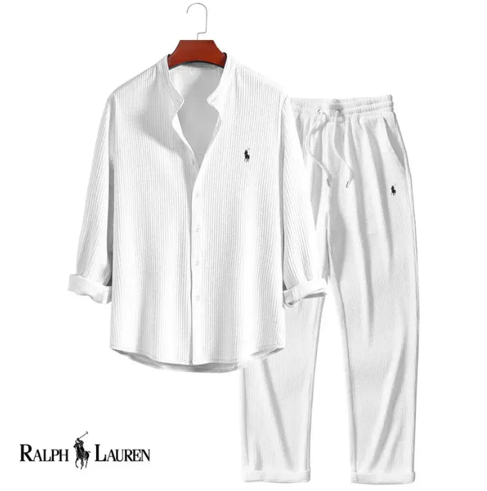 Upgrade your daily style with this men’s casual two-piece suit featuring a lightweight long-sleeve shirt and matching drawstring trousers.