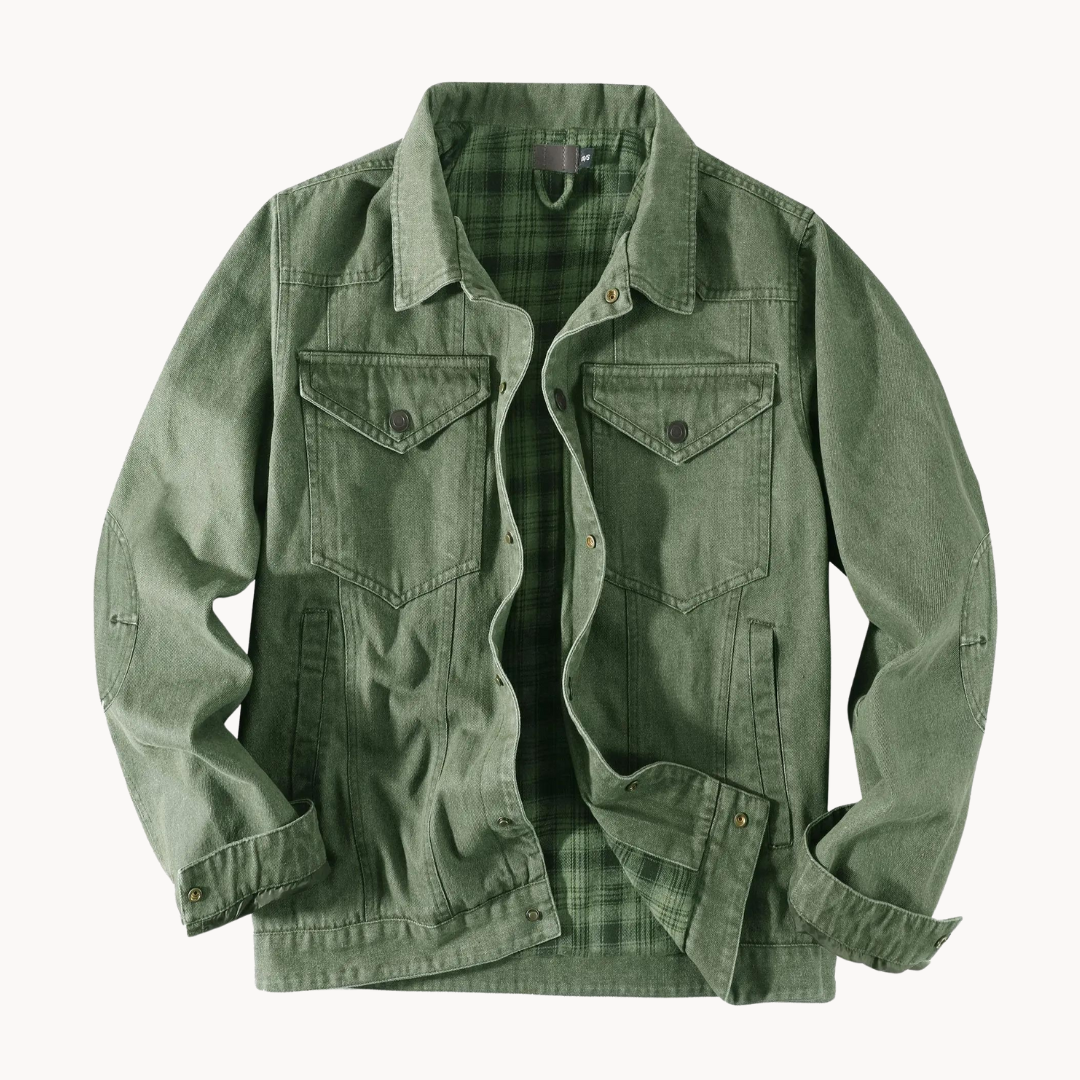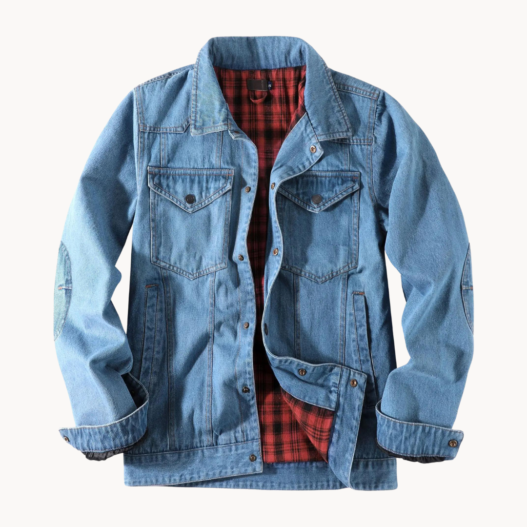 This rugged denim jacket features a classic silhouette with a warm, plaid flannel lining for both style and comfort, perfect for cooler seasons.